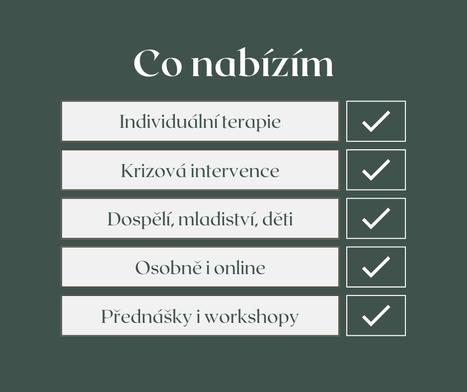 V rámci své praxe nabízím individuální terapii v oblasti psychologie a duševního zdraví. Pracuji s dospělými, mladistvými i dětmi. Terapii poskytuji formou 50 minutových konzultací osobně v Praze nebo online. Po domluvě mohu nabídnout i přednášky a workshopy na domluvené téma.